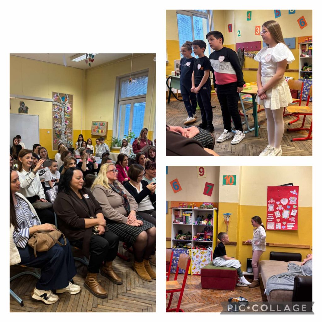 У одељењу 3/4 одржана је приредба и креативна радионица поводом 8.марта. Ученици су рецитовали, учествовали у скечевима, певали и на крају јако талентовано приказали једанан драмски текст који је све присутне забавио и насмејао приказујући један обичан дан сваке маме. У другом делу драмског текста видели смо један необичан дан сваке маме тј како изгледа када смо сви љубазни према мамама тог 8.марта. Кроз пријатну атмосферу чули смо стихове о мамама, закључили да је свака мајка света најбоља и да према мамама би требало сваког дана да будемо љубазни и добри. Кроз заједнички рад ученика и њихових мајки направљени су и украшени рамови мамама на дар. За крaj дружења направљен је заједнички пано „Дрво љубави“ које нам описује сваког ученика и његову/њену маму.