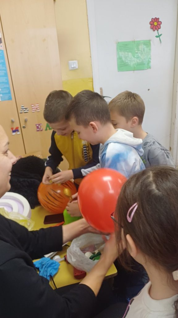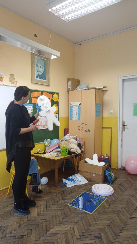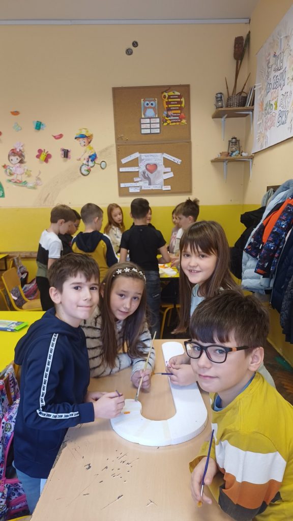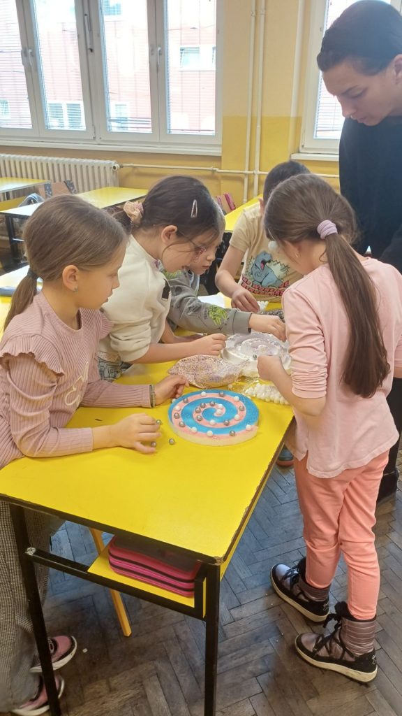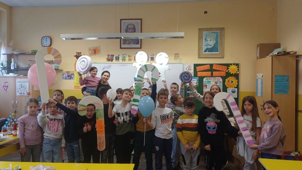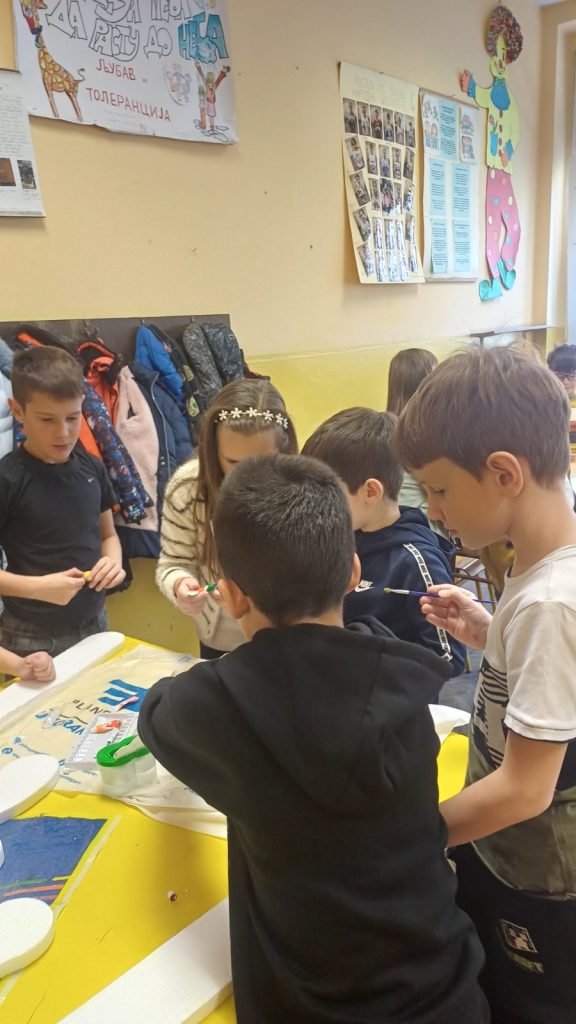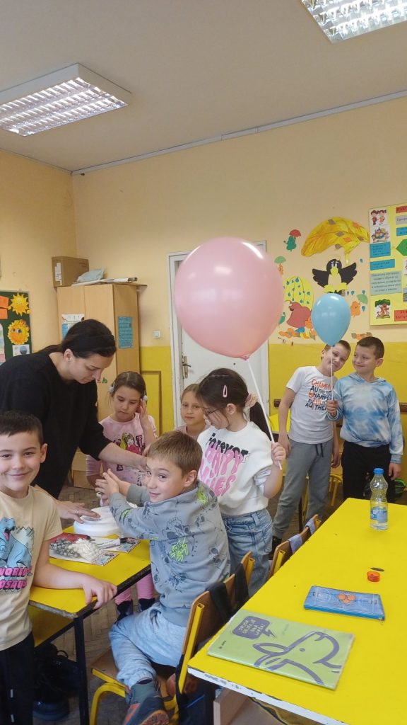 У оквиру обележавања тематске недеље – Почиње новогодишња чаролија, ученици II/4 и њихова учитељица Драгица Ђуровић угостили су маму друга Вукашина, Љиљану Старчевић, на часу Света око нас. Том приликом ученици су се упознали са обликовањем стиропора и гуме што је допринело проширивању стечених знања о материјалима. Вукашинова мама нам је приближила своје занимање, поклонила је за сваког ученика по балон и направила новогодишње украсе од стиропора које су ученици бојили и украшавали. У учионици се осећала и празнична атмосфера испуњена радошћу, смехом и креативношћу. Заједнички рад и добро расположење учинили су да стечено знање о својствима материјала буде трајније, а ове тренутке учини посебним и незаборавним.