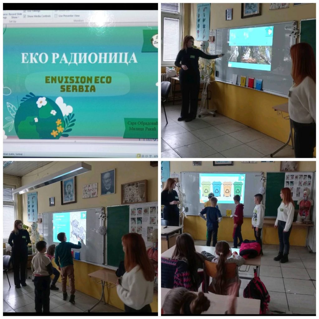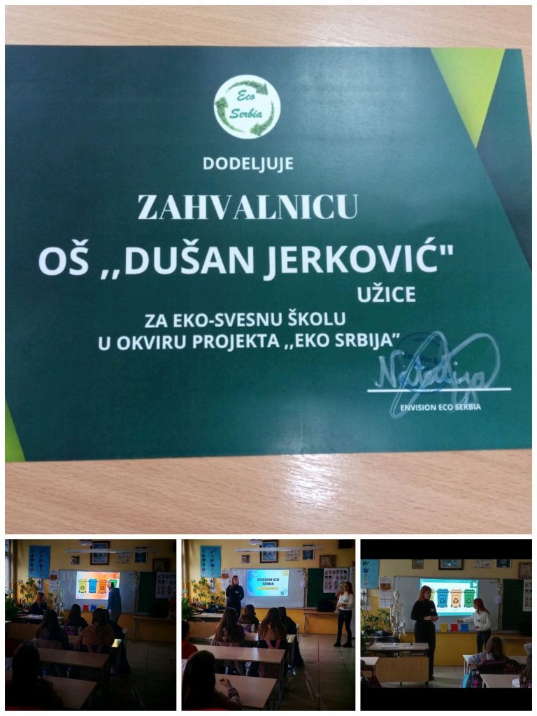 У нашој школи реалозоване су две едукативне еколошке радионице у организацији омладинског еколошког удружења Envision Eco Serbia. Радионицама су присуствовали ученици трећег разреда, ученици старијих разреда и чланови еколошке секције. Циљ радионица је подизање еколошке свести ученика о екологији, заштити животне средине, одрживом развоју и добрим еколошким праксама. Акценат је дат на еколошке проблеме града Ужица, парк природе Златибор као и на могућа решења еколошких проблема. Овом приликом нашој школи је додељена захвалница за еко – савесну школу у оквиру пројекта «Еко Србија».