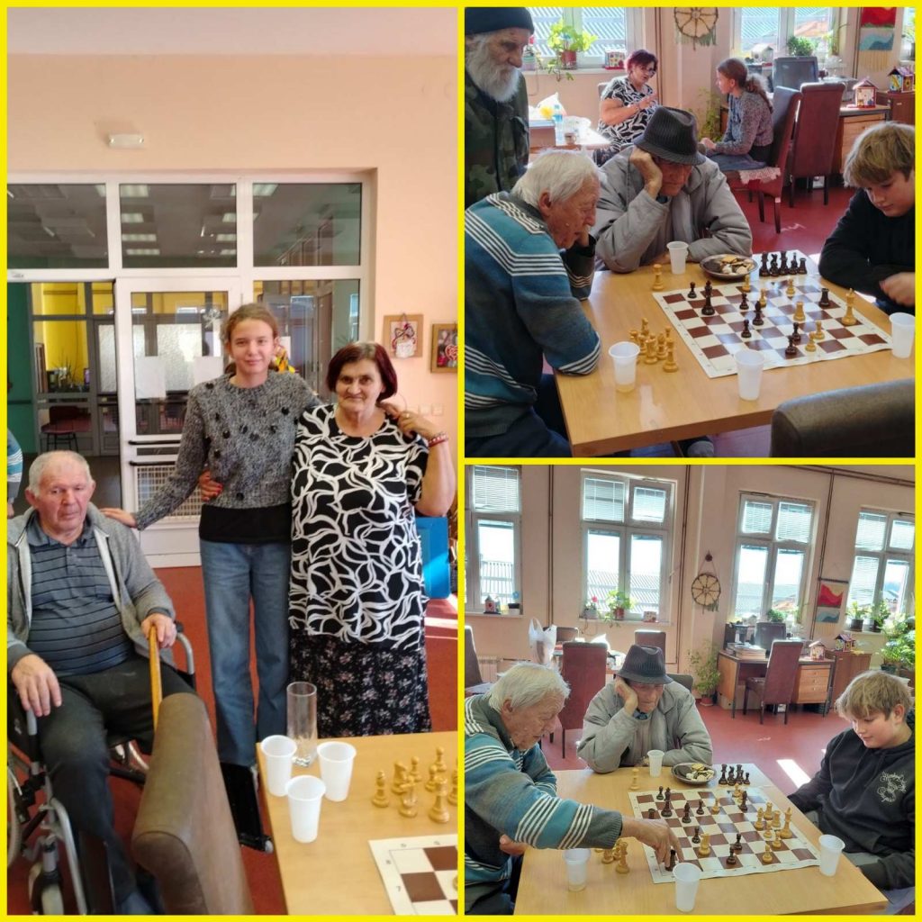 Ученици наше школе, Душан Бућић (VI3), Андријана Остојић (VII3) и Андреј Ђуровић (V4), чланови шаховске секције, су са наставником математике, Мирославом Минићем и педагогом школе, Богданом Марјановићем, који воде шаховску секцију, 29. октобра били у посети Дому за старе.