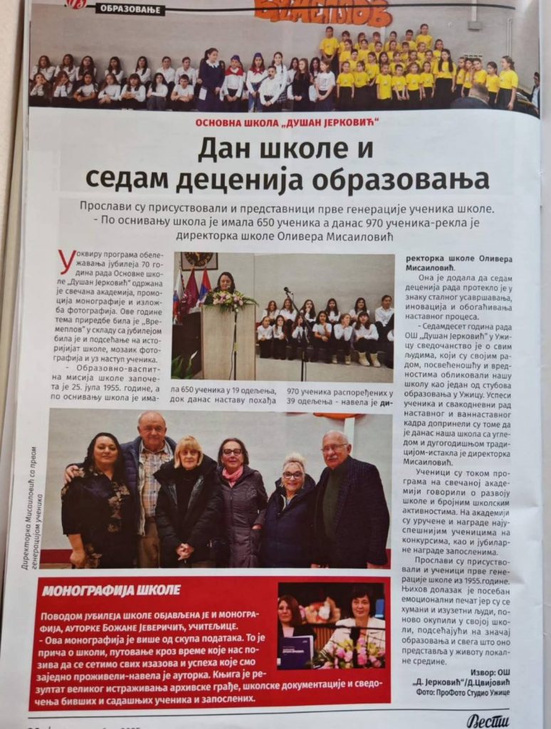 Поводом овог значајног датума, у препуној сали Градског културног центра 28.11.2025. године, промовисана је монографија ауторке Божане Јеверичић, у издању школе, која документује богат историјат школе, као и све напоре које су генерације наставника, ученика и сарадника уложиле у њену изградњу и развој.