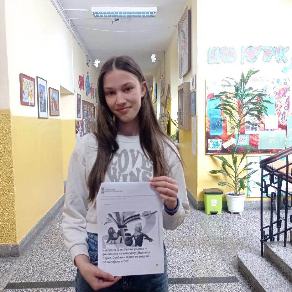 Међу изабраних 12 најбољих радова- финалиста на конкурсу “ Идемо у Париз, Срећко и Фриж те воде на Олимпијске игре“ је и наша ученица Селена Удовичић 8-1. Финалисти ће учествовати у Олимпијском квизу на тему олимпизма и олимпијских игара и игри меморије, а три најбоља такмичара, у пратњи родитеља, биће награђена путовањем на Олимпијске игре 2024. године.