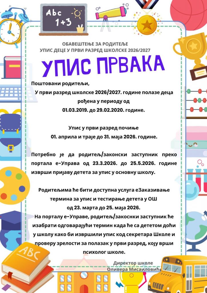 ОБАВЕШТЕЊЕ ЗА РОДИТЕЉЕ -УПИС ДЕЦЕ У ПРВИ РАЗРЕД ШКОЛСКЕ 2026/2027.ГОДИНЕ