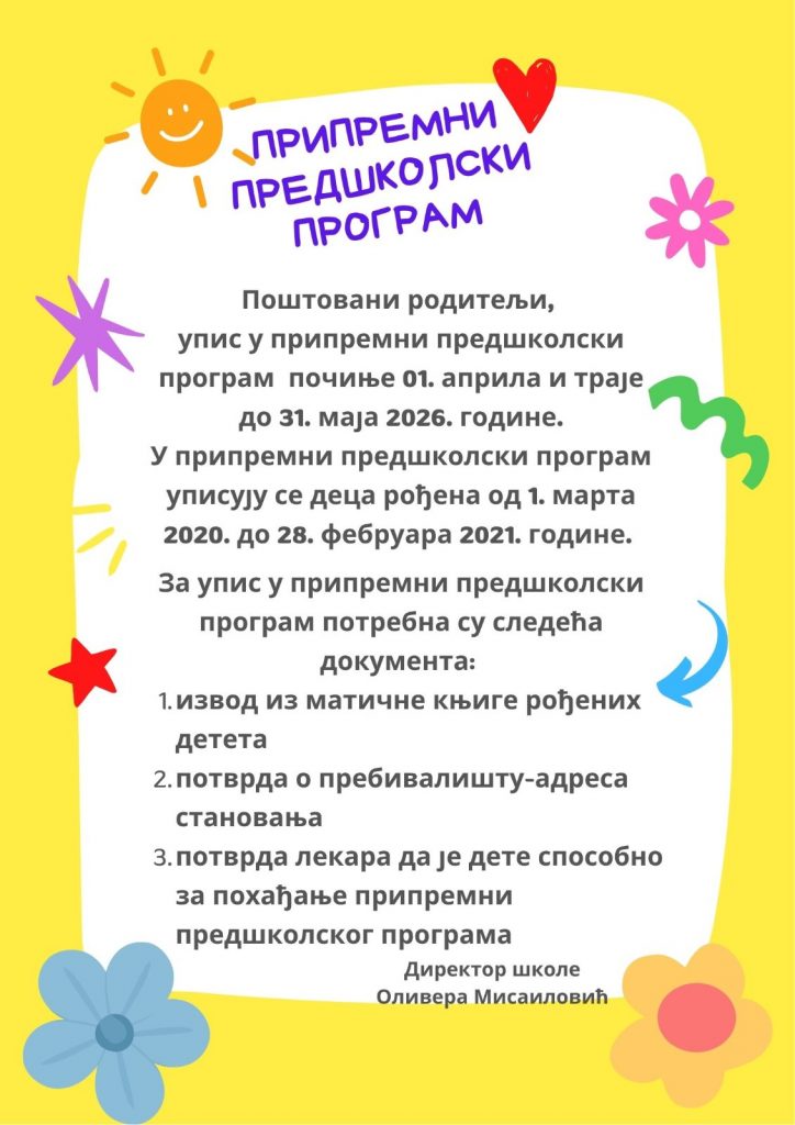 ОБАВЕШТЕЊЕ -УПИС У ПРИПРЕМНИ ПРЕДШКОЛСКИ ПРОГРАМ